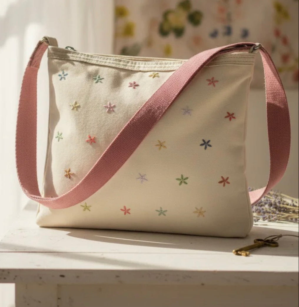 This simple off white denim features scattered embroidered flowers along with a pink strap.