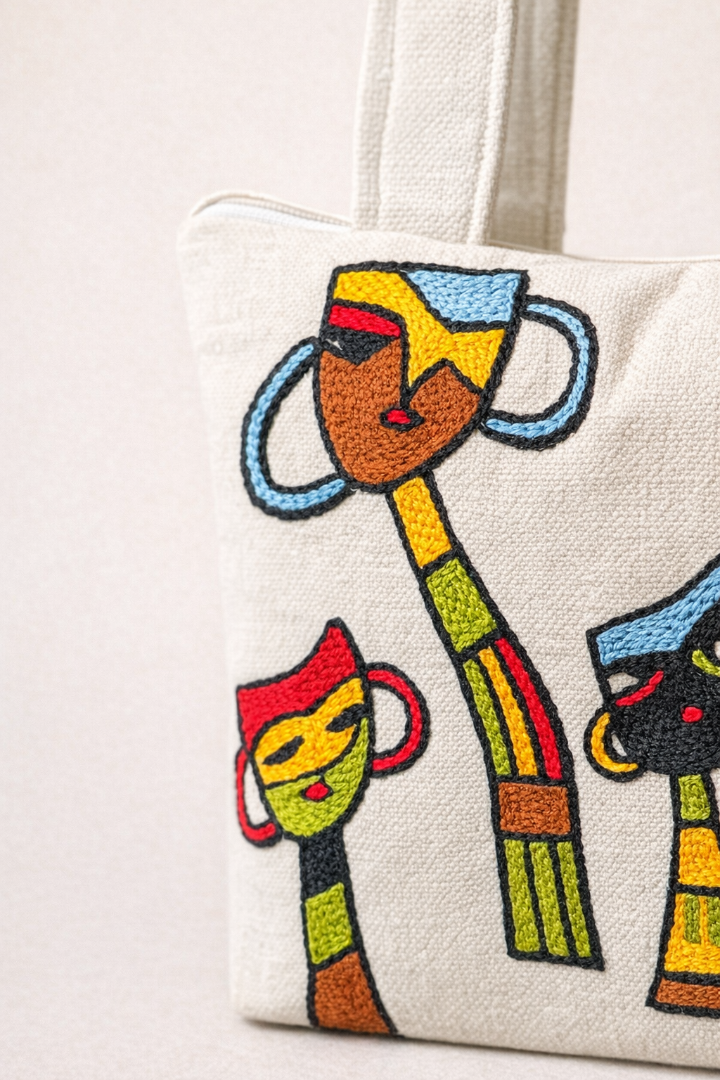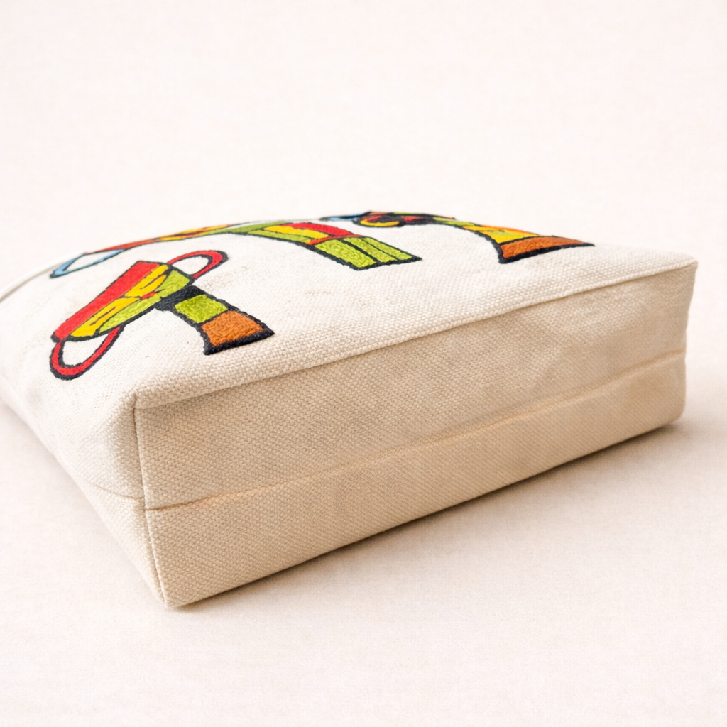 The Cappuccino Tote is crafted on premium canvas and detailed with an abstract character design, hand-embroidered using 3-ply crystal wool threading. Durable, lightweight, and spacious, it’s designed for everyday use with an artistic edge.