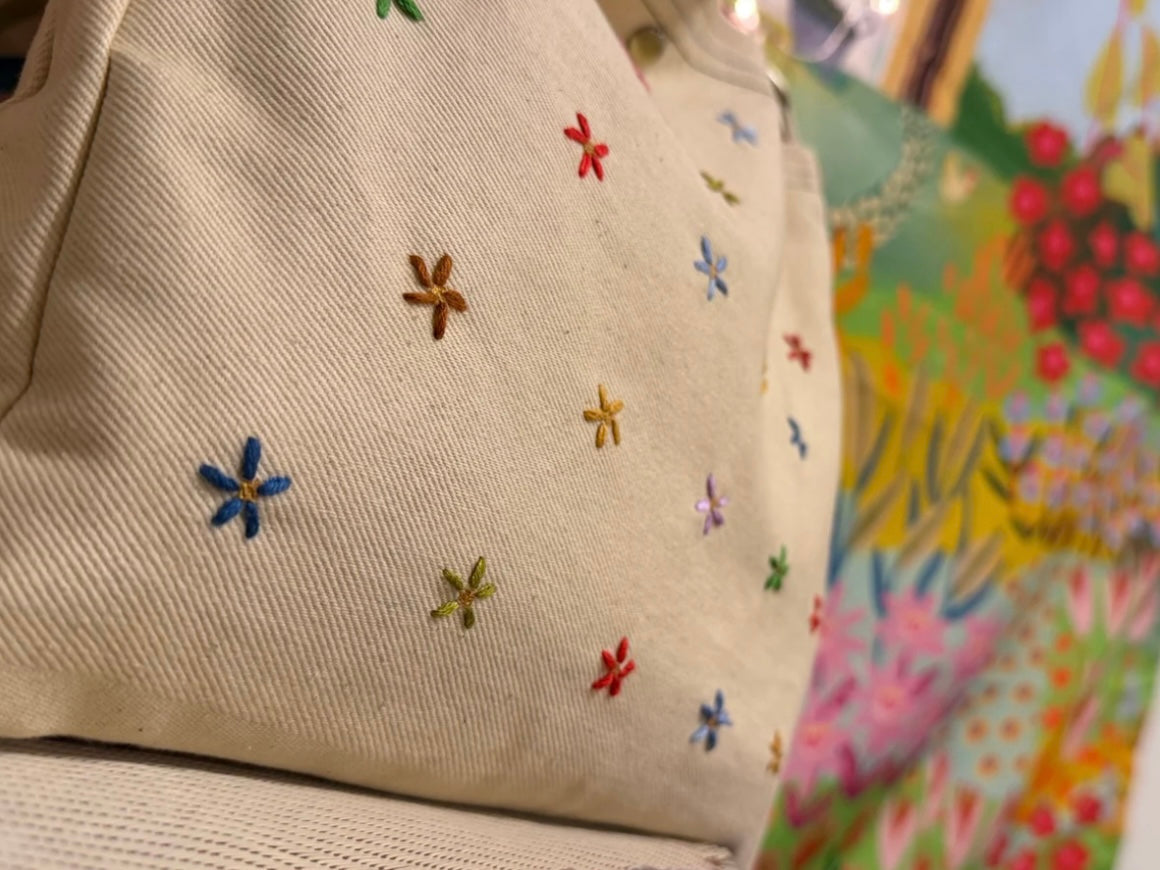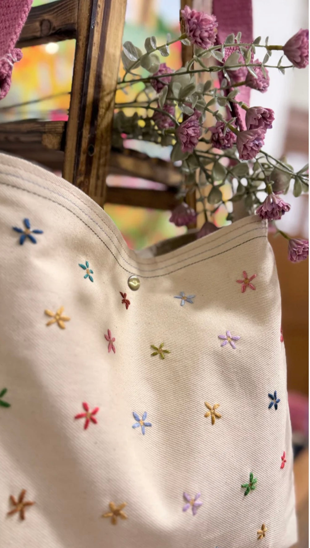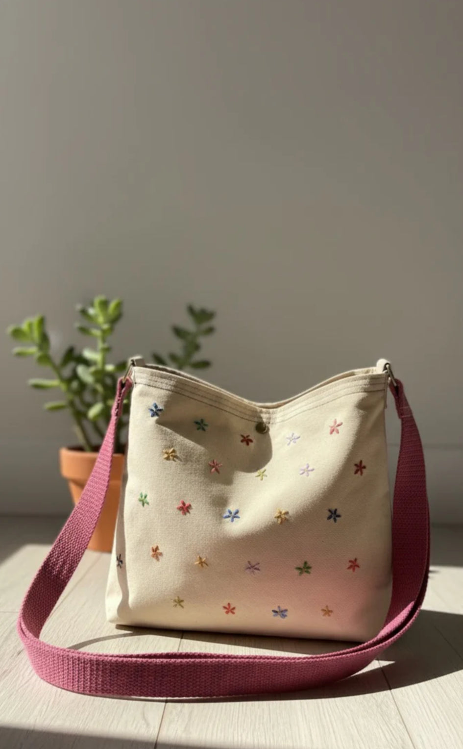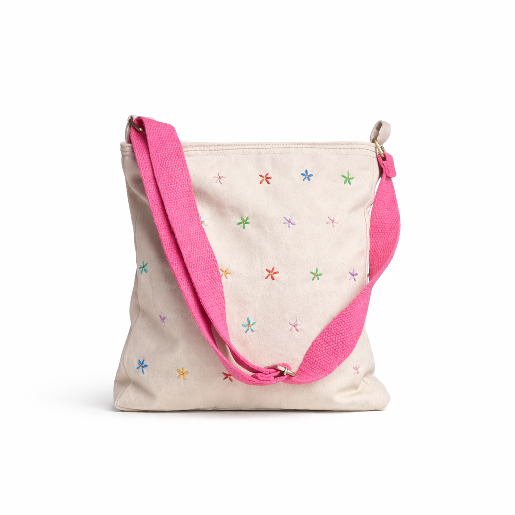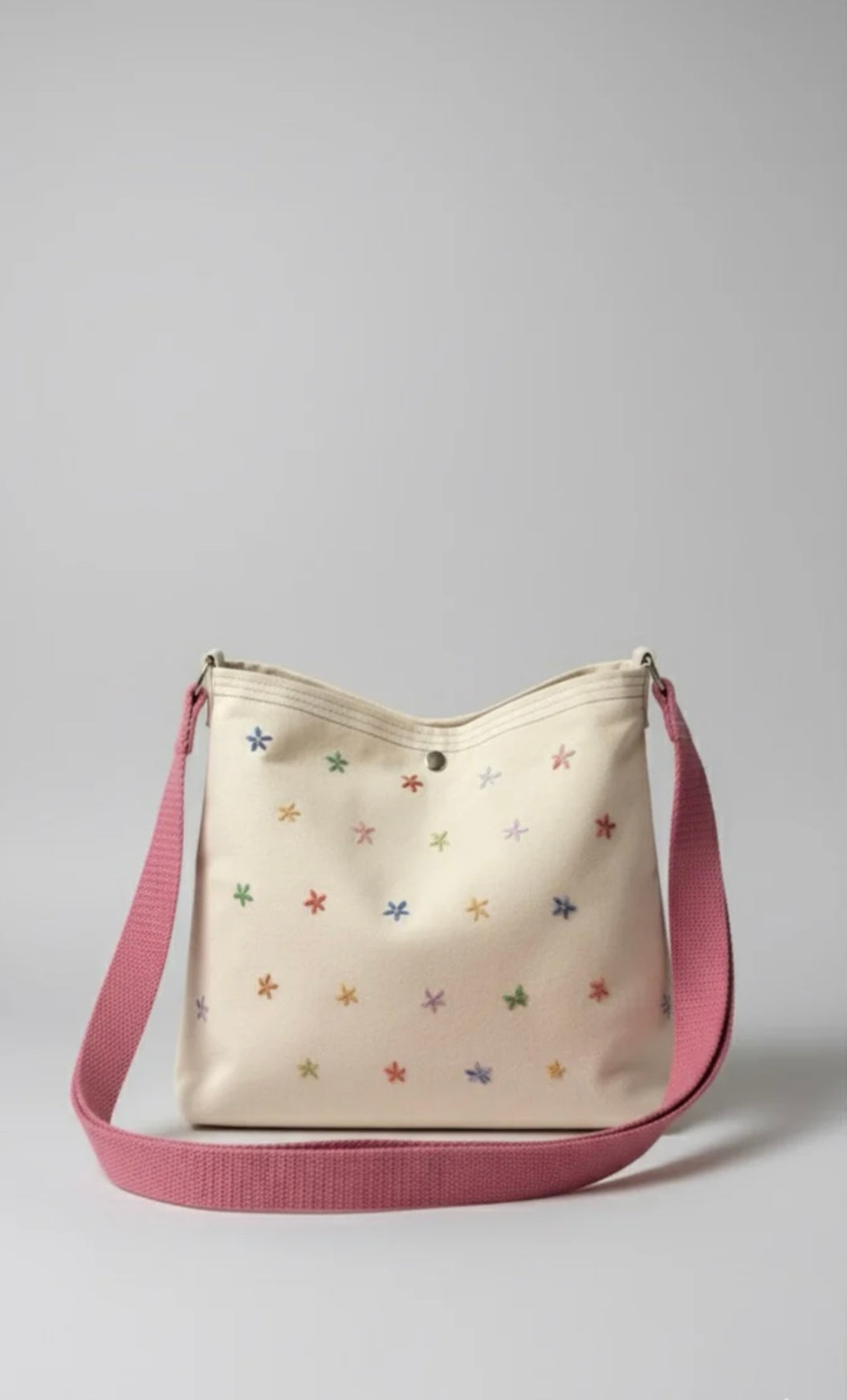 This simple off white denim features scattered embroidered flowers along with a pink strap.