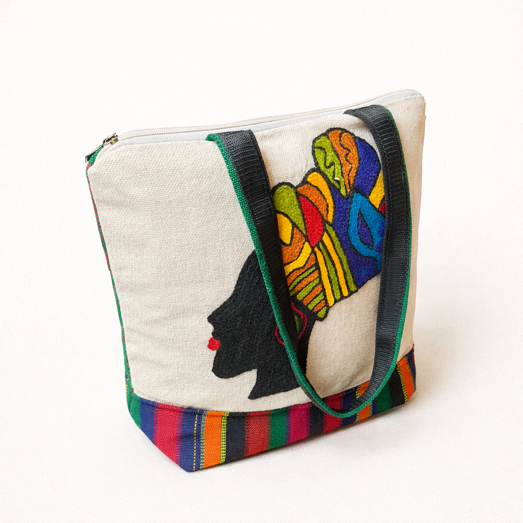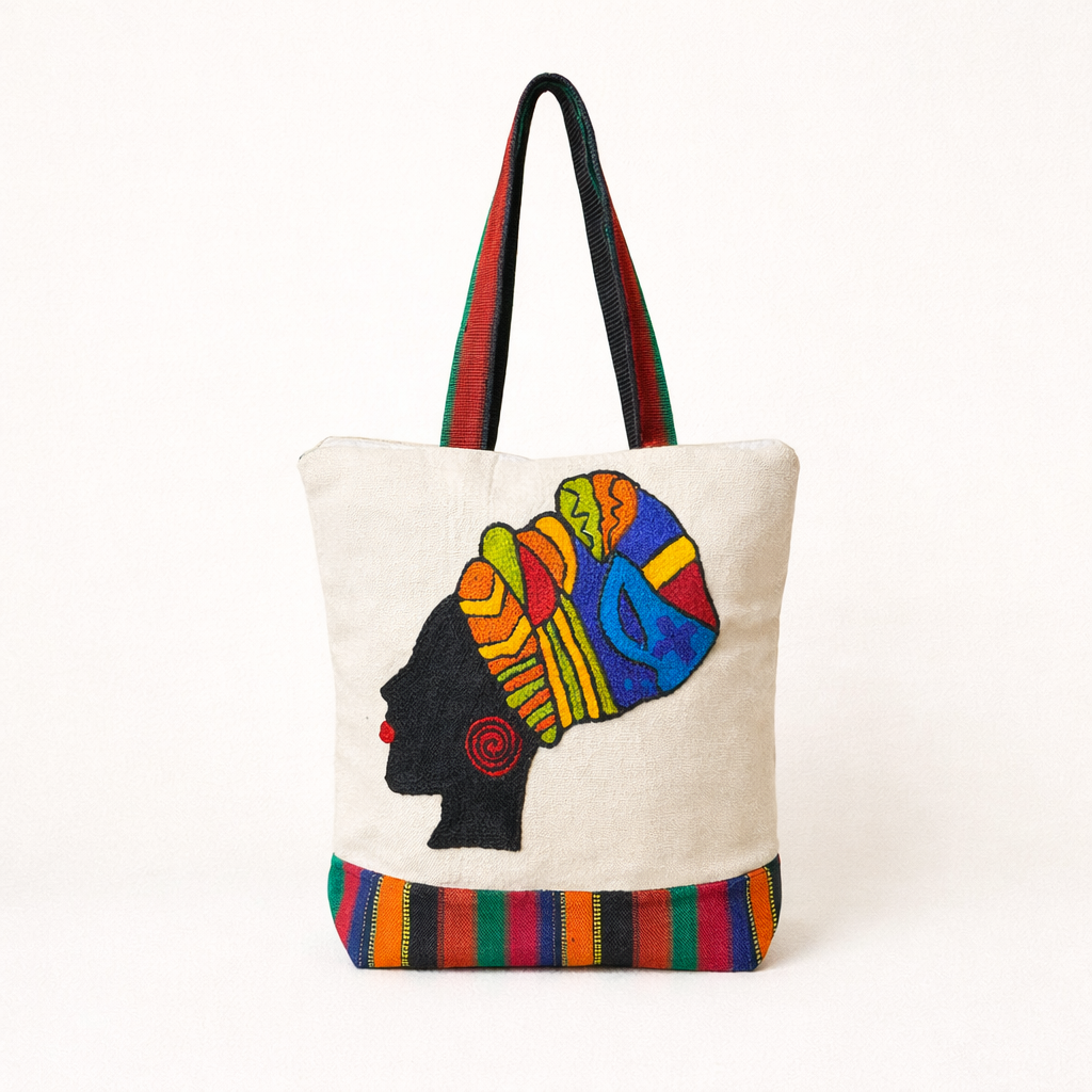 Royal Lady is a handcrafted canvas tote featuring an abstract tribal face design that represents strength and grace. Made on premium canvas and hand-embroidered using 3-ply crystal wool threading, it offers rich texture, durability, and everyday functional