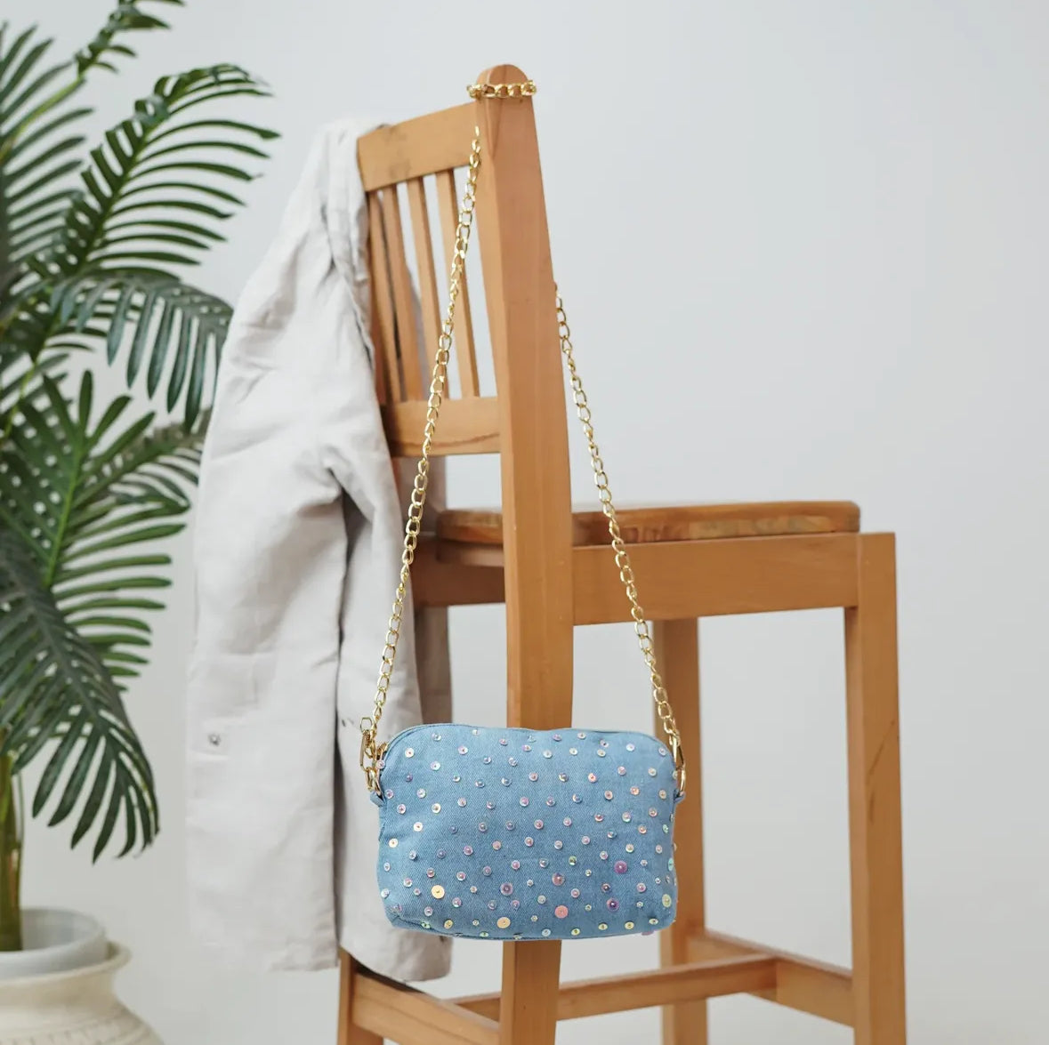 This crossbody combines style and practicality with its style and shimmer detailed work. With beatiful solid golden chain , it also offers inner 1 pouch and a zipper pocket. Perfect for any fashion lover on the go!